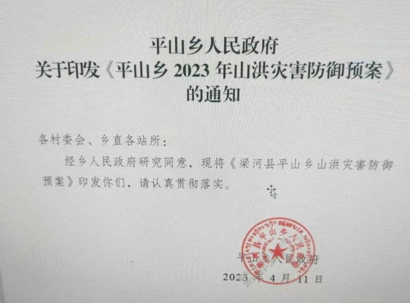 乡党委政府积极修订完善《平山乡2023年地质灾害应急预案》《平山乡2023年山洪灾害防御预案》《平山乡人民政府关于成立地质灾害防治工作领导小组的通知》细化工作方案,明确责任分工。