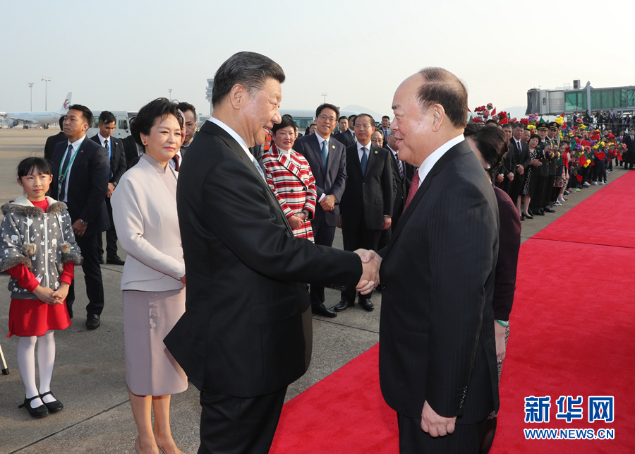 12月20日,中共中央总书记、国家主席、中央军委主席习近平圆满结束在澳门的各项活动,从澳门乘专机返回北京。这是欢送仪式上,习近平同前来送行的澳门特别行政区行政长官贺一诚握手。 新华社记者 鞠鹏 摄