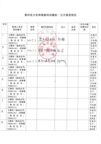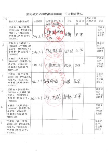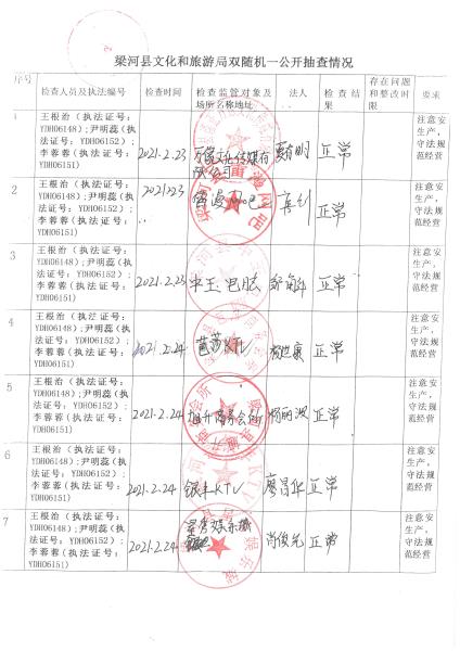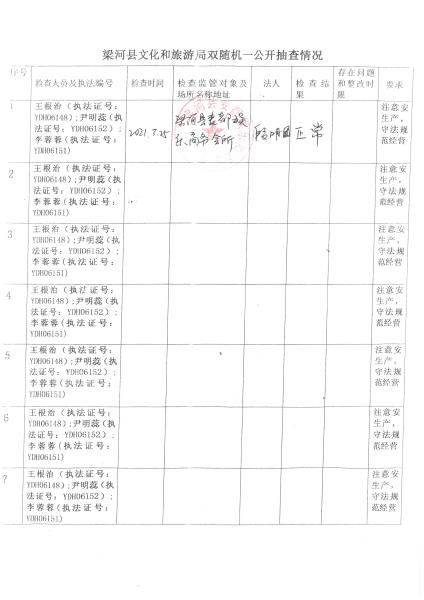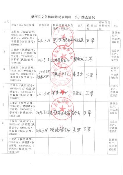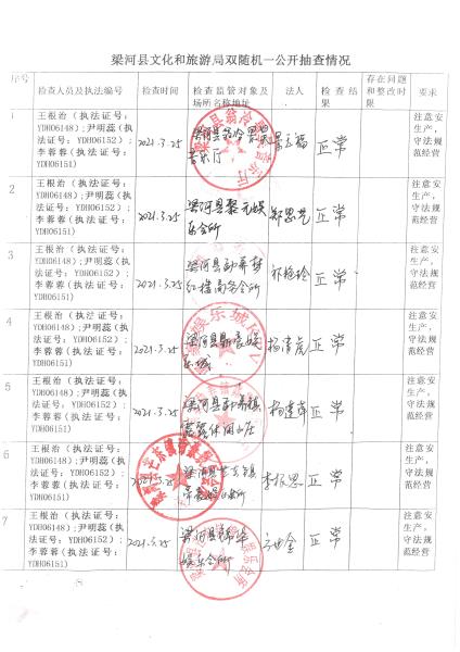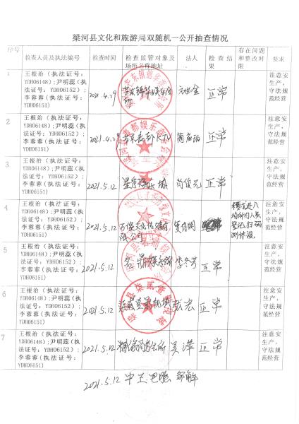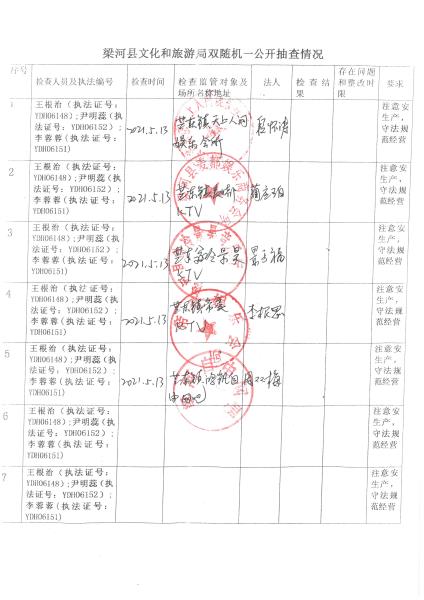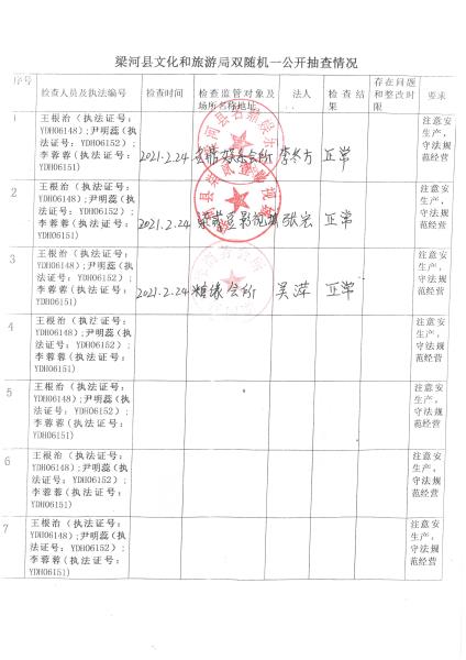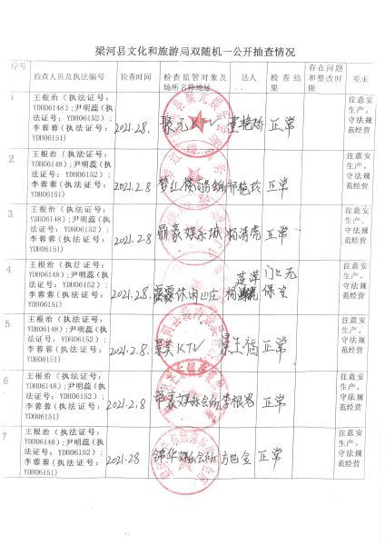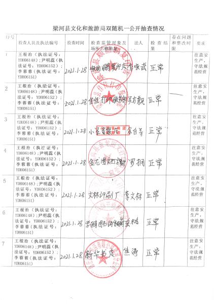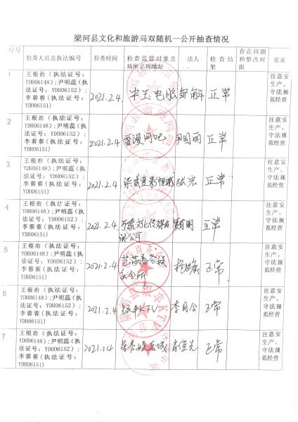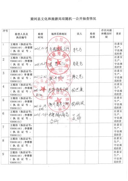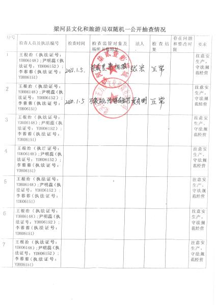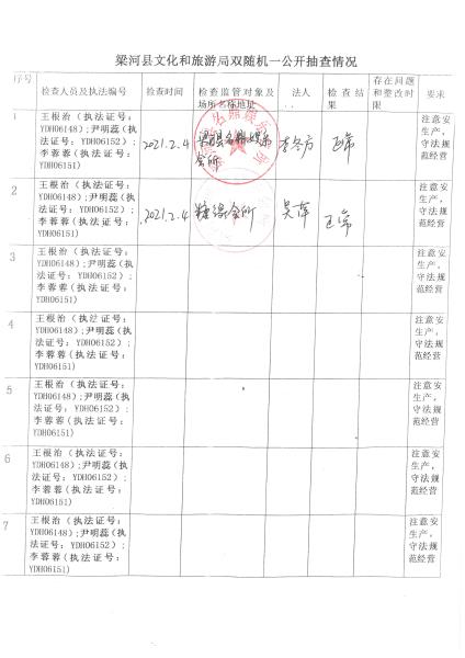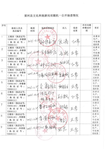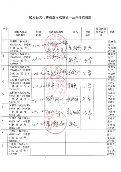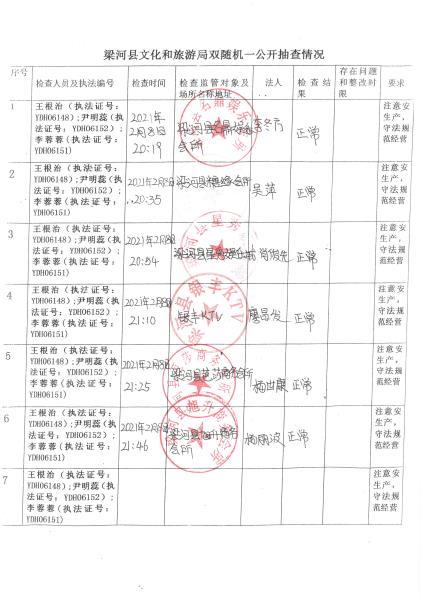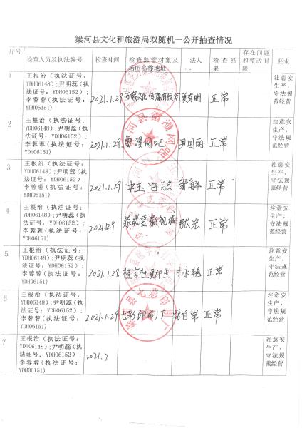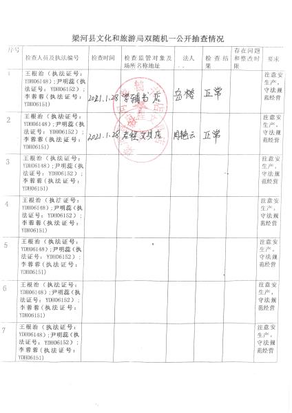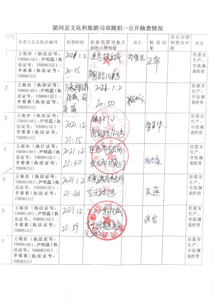 梁河县文化和旅游局“双随机、一公开”抽查情况2021年1—12月