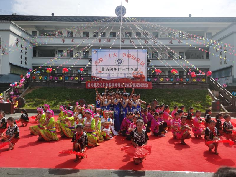 当“文化和自然遗产日”与“六一”相融在一起时,相信祖国的花朵在未来的时空里会把民族文化展示的淋漓尽致。6月1日早晨,梁河县文化和旅游局借助国际六一儿童节之际到曩宋中心小学开展非遗宣传展示展演进校园活动。此次进校园展示的内容有歌舞展演、文物展示、非遗成果展等,表演人员有曩宋中心小学师生、传承人、梁河县阿昌族文化传播有限公司演员及部分群众,共计七百余人,15个节目,分别展演了傣族孔雀舞、傣族象脚鼓舞、阿昌族民歌、葫芦丝演奏、傣族舞蹈、孤勇者等节目,深受全校师生的喜爱。在展示展演期间,学生这里一群那里一伙成群结队的主动和我们的传承人交谈民族文化,还请传承人交他们跳舞,唱歌,他们对民族文化特别的感兴趣,从而激发学生努力学习的心态、斗志学生实现自己心中的梦想。
