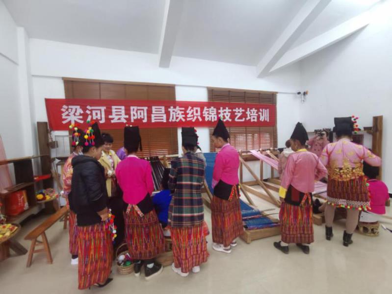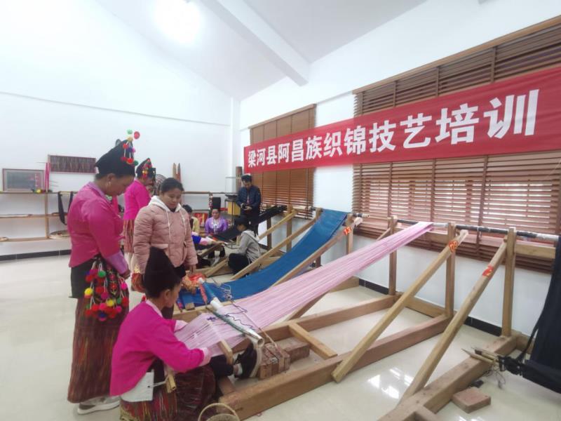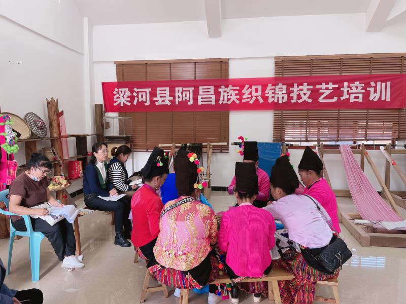 阿昌族织锦技艺历史悠久,明清时期,就已有史料记载。阿昌族有“一天要织三机布,一夜要登布三机,织到鸡叫放下刳,打个哈欠做饭去”的民谣。之所以阿昌族妇女得从小掌握该技艺,传承本民族传统文化。随着社会的改革,掌握阿昌族织锦技艺的人数越来越少,多数是中年人。为了让更多的人掌握该技艺,做到世代传承,梁河县文化馆决定举办一期阿昌族织锦技艺培训。
