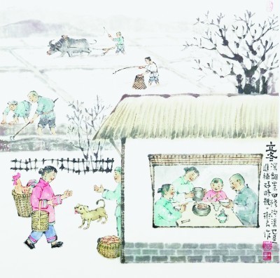 立冬之后天气渐寒,身体需要储存足够的能量,因此立冬之日有“立冬补冬”的习俗。北方多吃饺子,取秋冬“交子之时”的寓意,而南方则喜食鸡鸭鱼肉等温补之物。戴树良的中国画作品《立冬》中,身着鲜艳冬衣的妇女满载而归,屋内的桌上早已炖好羹汤,热气腾腾,鲜香扑鼻。一家人围坐在一起,共话秋的收获,共享初冬的惬意时光。不远的农田里,青壮劳力们正抓紧最后的耕作时间深翻农田、修筑沟渠,一派热火朝天的繁忙景象。