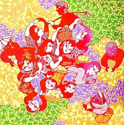 中国南方地区因气候相对温暖,一年四季作物都较为丰富,立冬时的农事活动便显得更为多样。余红梅的农民画作品《立冬》表现了浙江衢州一带柑橘丰收时的场景。茂密的橘树林里,人们背着布袋、挑着箩筐,将又大又圆的果实采摘下来,一片欢歌笑语。作者运用剪纸的造型方式塑造人物,将民间工艺的朴拙和现代美术的设计感融会贯通,画面语言丰富而有趣。黄澄澄、绿油油、红彤彤的斑斓色块营造出浓烈的喜庆氛围,正是新时代农村幸福生活的传神写照。