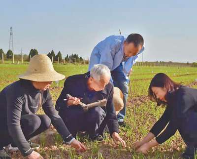 赵瑜(左二)在观察记录小麦生长情况。 |