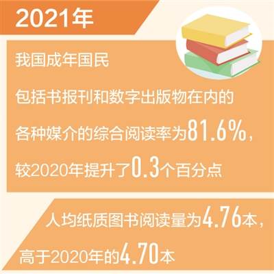 2021年,我国成年国民包括书报刊和数字出版物在内的各种媒介的综合阅读率为81.6%,较2020年的81.3%提升了0.3个百分点;图书阅读率为59.7%,较2020年的59.5%增长了0.2个百分点;数字化阅读方式(网络在线阅读、手机阅读、电子阅读器阅读等)的接触率为79.6%,较2020年的79.4%增长了0.2个百分点;人均纸质图书阅读量为4.76本,高于2020年的4.70本;人均电子书阅读量为3.30本,高于2020年的3.29本。