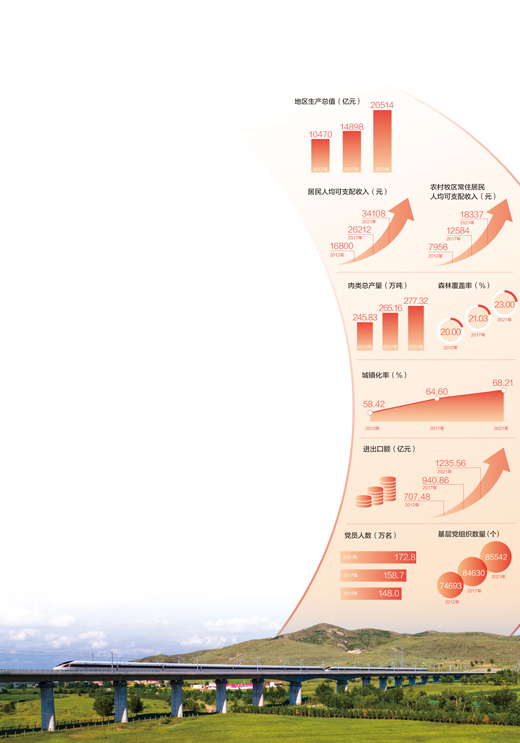 十年来,各族群众的吃穿用度、生活品质都有了显著提高,随着社会发展、居民富足,人们的思想观念也跟上时代发展潮流。高铁穿行草原之上,互通互达的航空运输网络让出行更加便捷,公共服务向农村牧区延伸,让农牧民足不出户就能享受“上门服务”;电子商务走进农村牧区,让农牧民直播带货更为便捷。如今,在内蒙古这片富饶美丽的土地上,各族群众团结奋进,把祖国北部边疆这道风景线建设得更加亮丽。