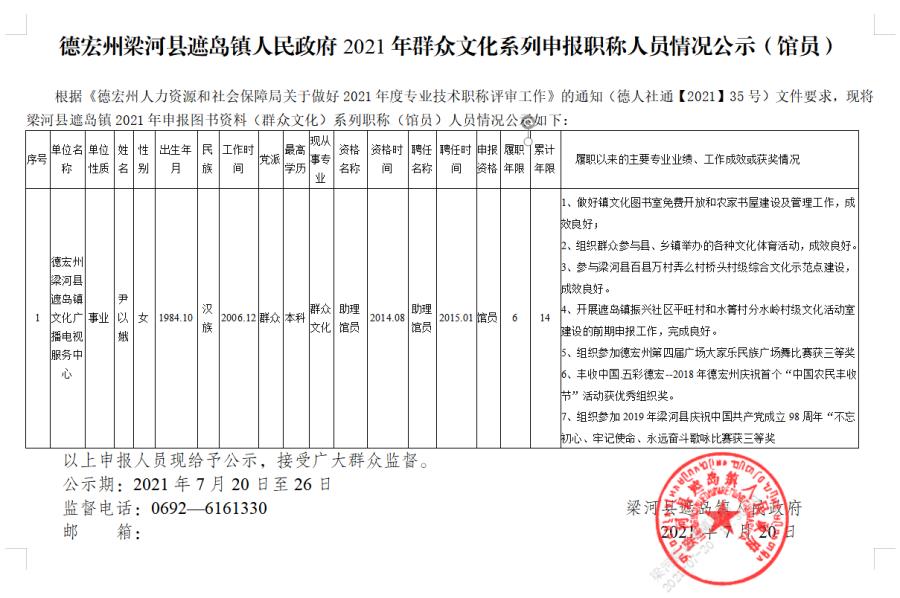 德宏州梁河县遮岛镇文化广播电视服务中心2021年群众文化申报职称人员情况公示(馆员)