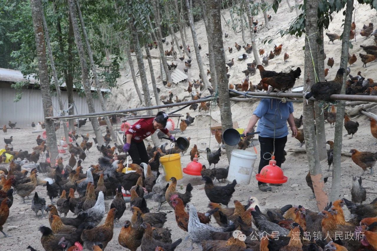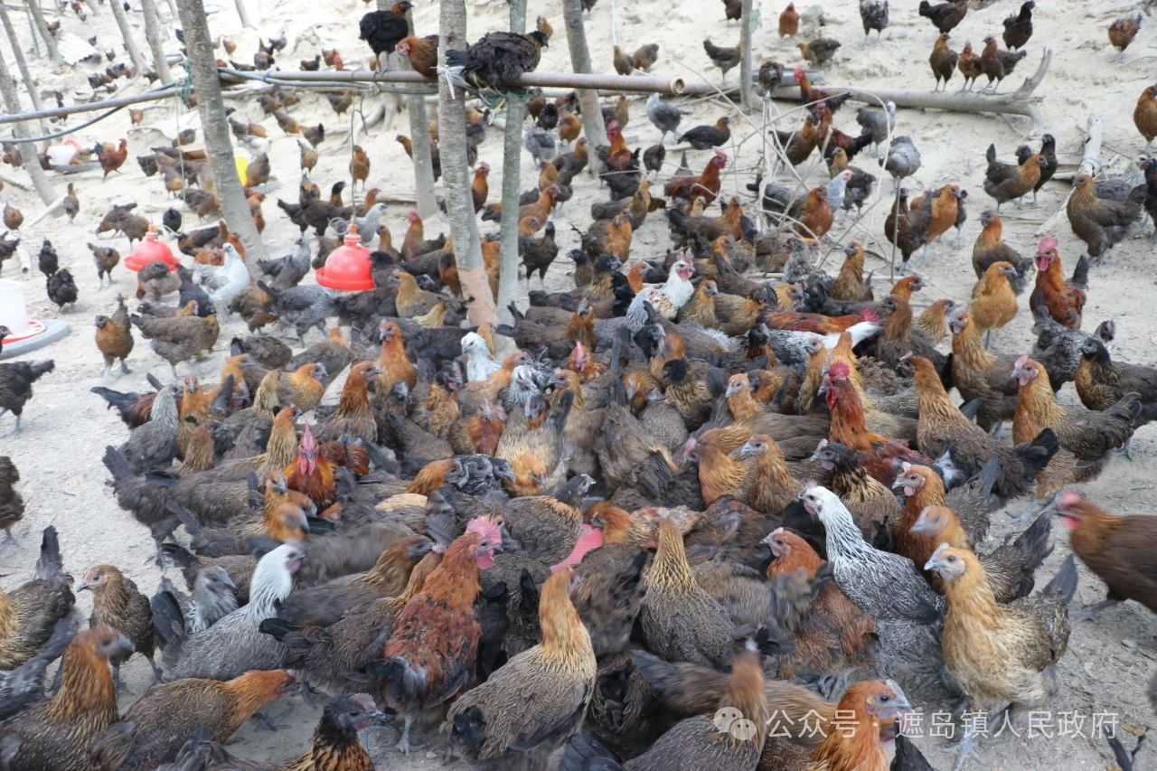 在遮岛镇弄么社区南赛浩后山,有一个裤脚乌鸡养殖家庭农场,占地面积60亩,养殖的土鸡存量8000只。走进养殖基地,喧嚣之声如浪潮般涌来,农场主人贺洪正忙着给鸡喂食,千余只鸡向食物飞奔而去,扑腾着翅膀围在他的脚边,叽叽咯咯地欢叫着争抢食物,一幅热闹而和谐的画面映入眼中。