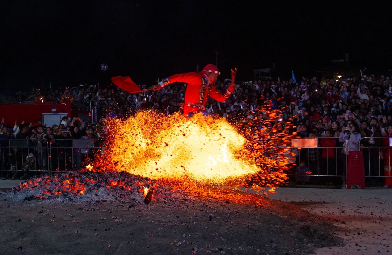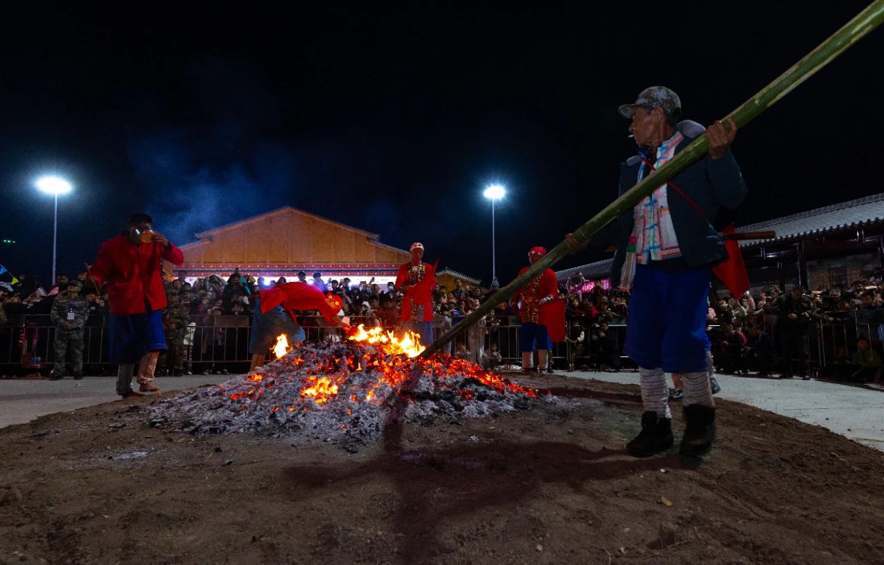 日暮时分,傈僳族长者余正来手持松明火把登上祭坛,点燃圣火,火光照亮全场。夜色中,活动迎来高潮——国家级非遗傈僳族绝技“下火海”。火塘中栗炭烧得通红,傈僳族小伙们毫不犹豫地赤脚跃入火海。他们在火中翻滚、踢踏,溅起的火星如金雨点般纷飞,而他们却毫发无损。观众无不屏息凝视,现场随后爆发出雷鸣般的掌声。表演者脚底厚厚的老茧,每一道都见证着他们与火的一次次亲密接触。
